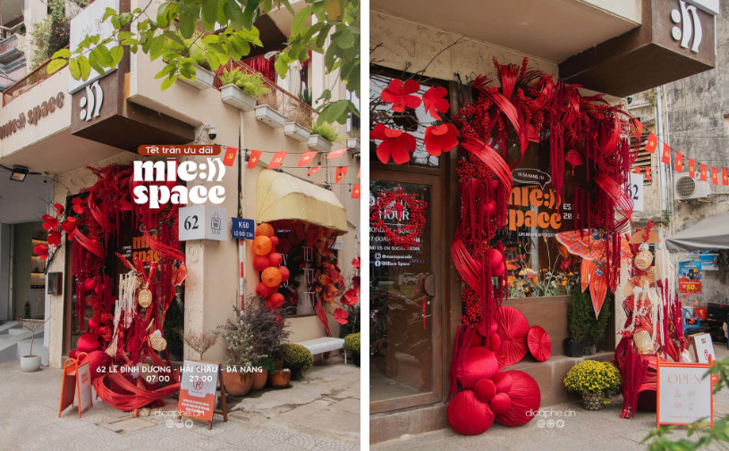 Một cái tên tuy còn khá mới nhưng luôn được ngóng chờ nhất mỗi dịp đổi concept decor, bởi sự đầu tư chỉn chu, sáng tạo và trendy. : nổi bật một góc phố nhộn nhịp ngay giữa TTTP, mang đến không khí Tết đầy tràn trong từng ngóc ngách. Tết nhà Miên là sự giao thoa giữa nét truyền thống và hơi thở hiện đại. Tông màu đỏ chủ đạo, nhiều chi tiết bắt mắt và vô vàn góc để check-in.