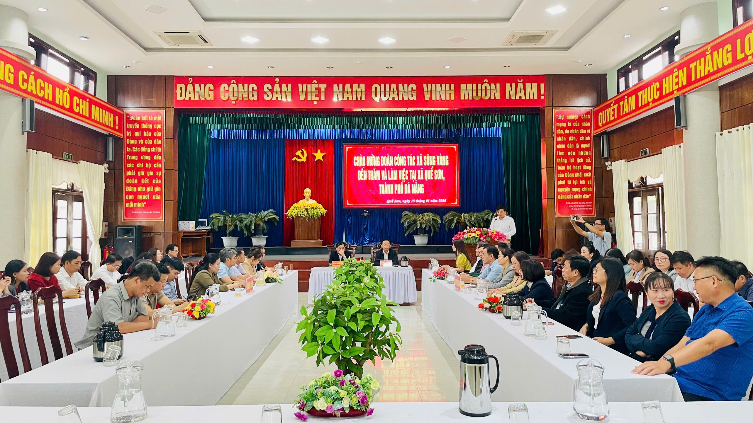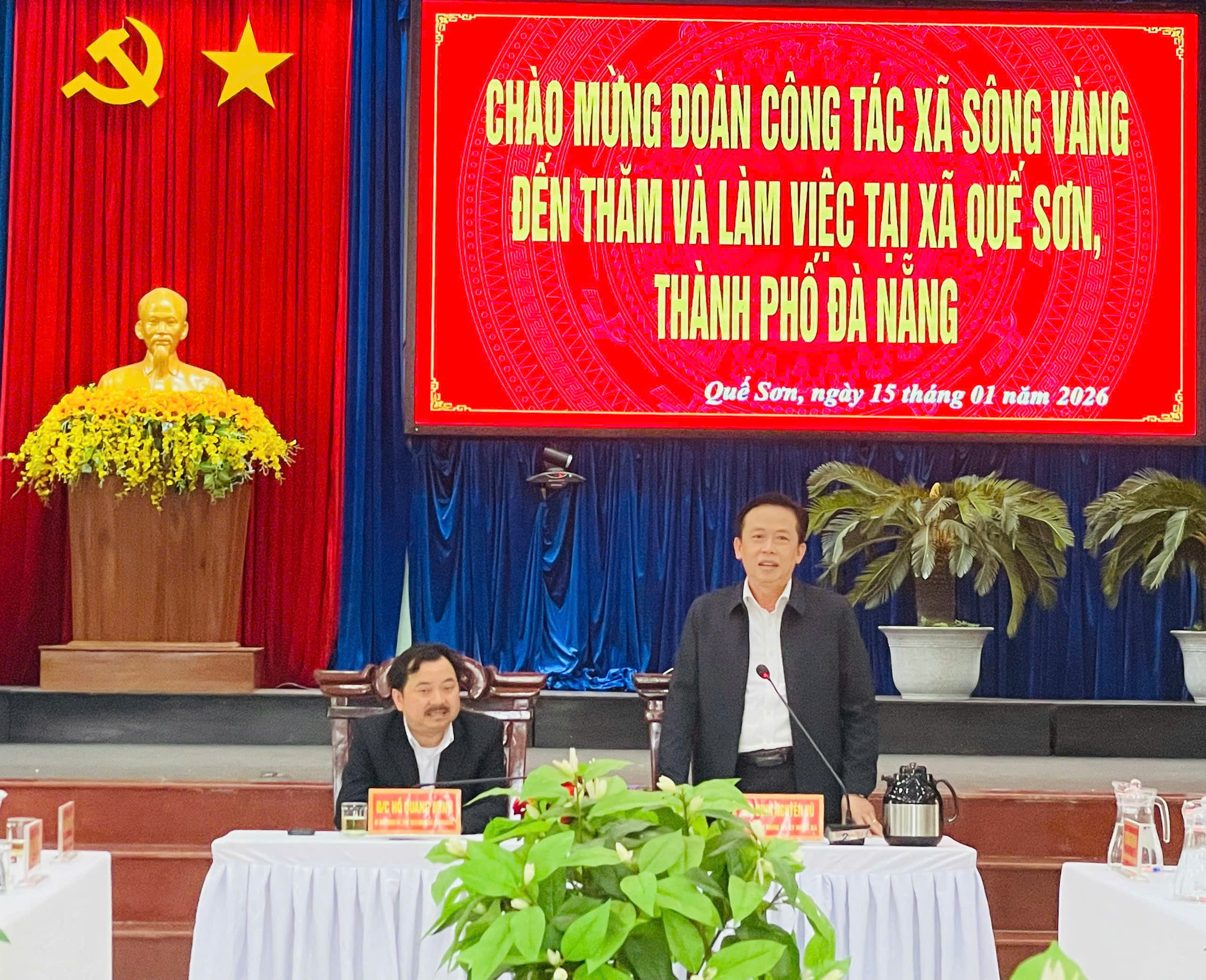 Chiều ngày 15/01, Đoàn công tác của Đảng ủy, HĐND, UBND, Ủy ban MTTQ Việt Nam xã Sông Vàng do đồng chí Hồ Quang Minh – Bí thư Đảng ủy, Chủ tịch HĐND xã làm trưởng đoàn đến thăm và làm việc với xã kết nghĩa Quế Sơn. Tiếp và làm việc với đoàn có đồng chí Đinh Nguyên Vũ – Thành ủy viên, Bí thư Đảng ủy, Chủ tịch HĐND xã; các đồng chí trong Ban Thường vụ Đảng ủy, Thường trực HĐND, lãnh đạo UBND, Ủy ban MTTQ Việt Nam xã, các đồng chí trong Ban Chấp hành Đảng bộ xã; lãnh đạo các cơ quan, ban, ngành của xã.